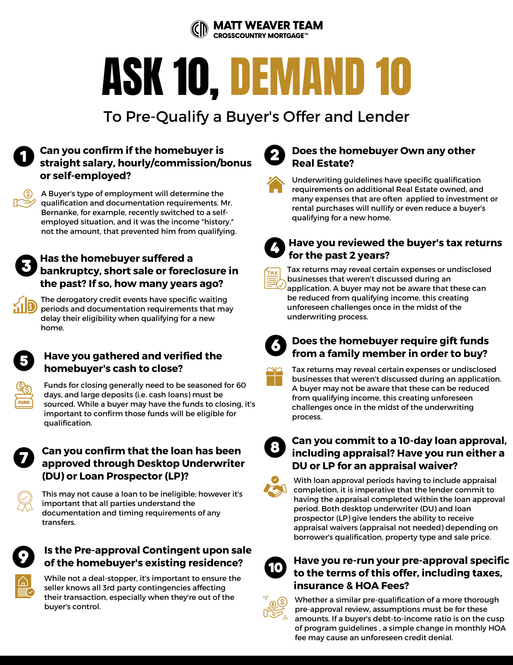 10 questions to ask a buyer's lender, allowing you to pre-qualify the buyer and demand a 10-day closing for your sellers.