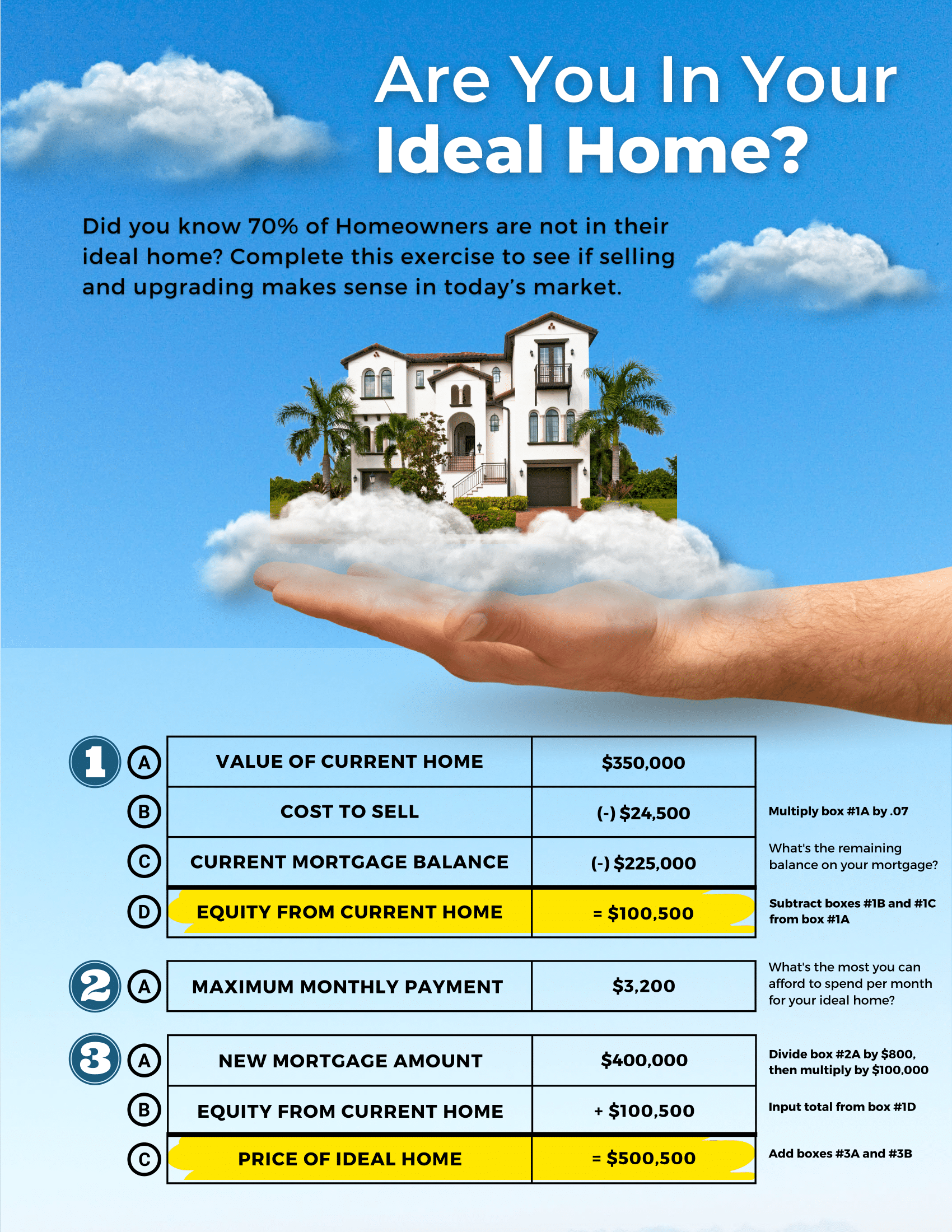 Use this exercise to easily calculate and show homeowners the value of selling and upgrading in today's market..